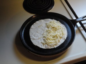 I got out my cast-iron fajita pan for this, but you can use any frying pan that’s big enough to hold a tortilla. I set the burner on medium high. Once the pan was heated, I placed a tortilla (I’m using store-bought tortillas for this test) in it and sprinkled some grated Cheddar on half of it.