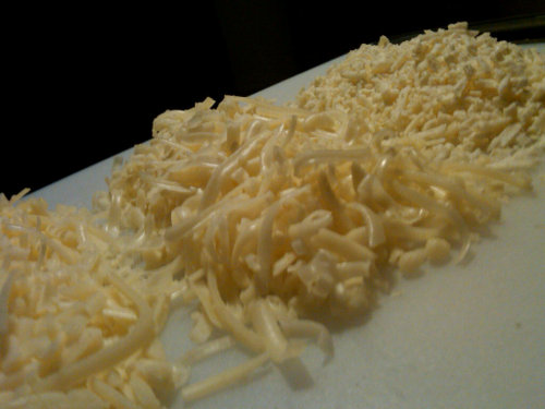 I bought the cheese in blocks and grated them myself. The Cheddar and Jack grated as expected, but the Queso Blanco was a lot like Feta in consistency and really sort of crumbled rather than grated. Mmmm, feta. One of these weeks is going to be Greek-themed solely to give me an excuse to have feta for five days straight.