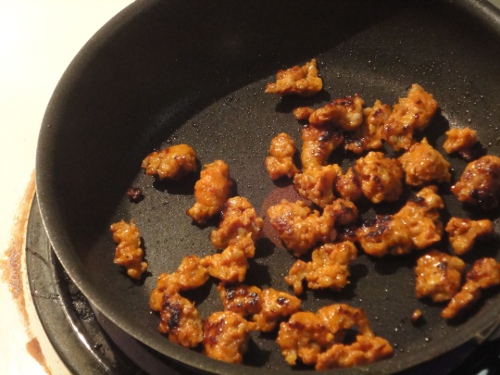 While the potatoes are being boiled into submission, slice those links of sausage length-wise and remove the casings. Break up the sausage into small chunks and brown them as you would ground beef. Toss in a good pinch of Rosemary leaves, you don’t need many. Rosemary and potatoes are buddies, so I thought it would work well. When they are all crispy and delicious, set them aside. I usually wrap them in a paper towel. Try not to eat the sausage, you’ll need it later.