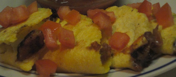 Heat up your frying pan or skillet over medium heat. If you’re using fresh tortillas, then medium-high might be better. Place your first tortilla on the pan and sprinkle some cheese on it. Then spoon some sausage and potato onto half of it.