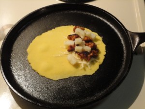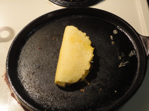 You don’t want to load it up with topping, it’s not a taco. Fold the tortilla over the topping and give it a little press.