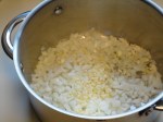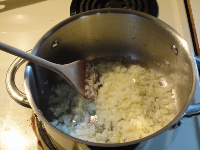 Heat the oil in a large pot over medium heat. Add the chopped onions and garlic, and saute them for 5 minutes or so. You don’t want to brown them, you just want them to give them a head start.