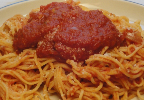 This is the point where you can start making this sauce your own: go ahead and taste it. Do you like more garlic? Add it. It is not sweet enough? Add more sugar. Make your adjustments in very small amounts. You should do most of the tweaking in the first ten minutes or so. Just make sure that you add any dried herbs early enough that they have a chance to hydrate and cook into the sauce. I actually put in more crushed red peppers than this recipe specifies because I like the extra spice.