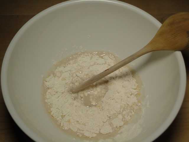 Add the butter, then start adding the flour about half a cup at a time. I mix it with the handle of a wooden spoon.