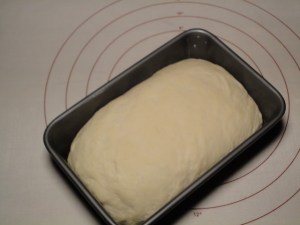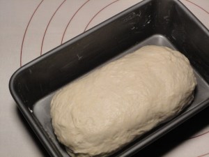 Once it has doubled, take it from the bowl and punch it down. This means that you mash the dough to burst all of the air bubbles inside of it. Then form it into sort of a rounded rectangle and place it into your greased loaf pan.