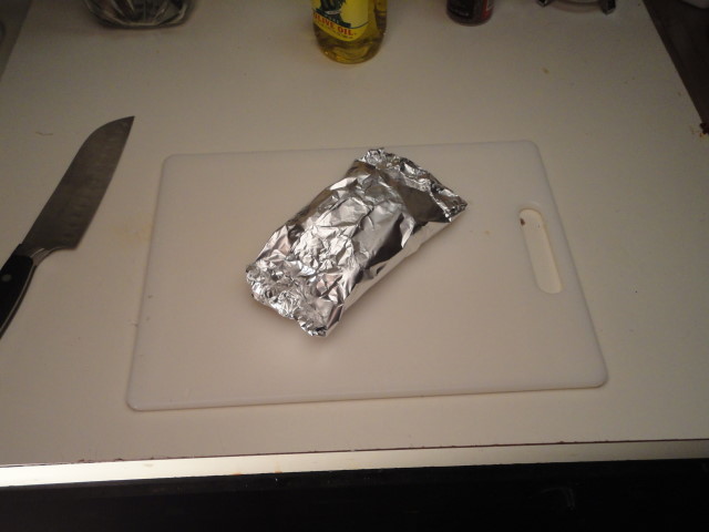 Next put the heads onto some foil, and pour some olive oil over each one. Then fold the foil into a nice packet. I do that same to cook veggies on the grill.