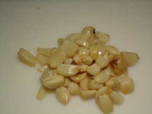 Let them cool as long as you can. They may seem cool on the outside, but don’t forget there’s oil on the inside. Once they’ve cooled, squeeze the cloves out of their skins one by one. They should come out pretty easily. If there are any that didn’t get cut in the beginning, you may have to cut them open. If you don’t want a garlic manicure, you should probably use some kind of plastic gloves.