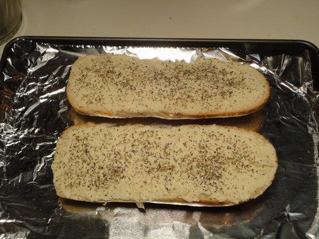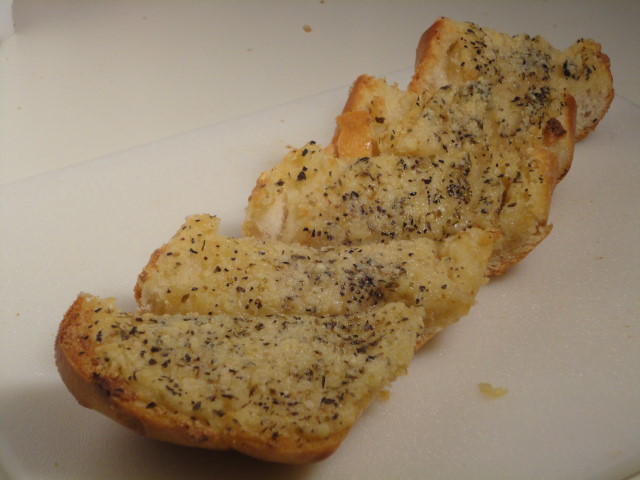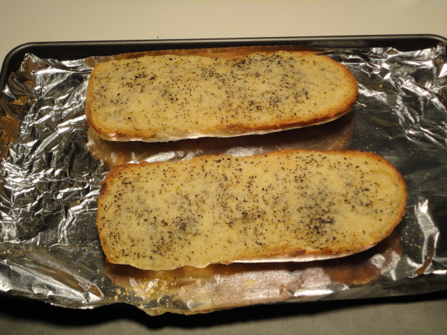 You oven should be up to temperature by now, so put the pan or foil into the oven. Bake it for 15 minutes or so. Once it starts looking like the bottom of the bread is toasted and the butter is melted, turn on the broiler. Be sure to keep an eye on it, a few seconds can mean everything with the broiler. Once the top gets nice and brown, take it out.