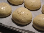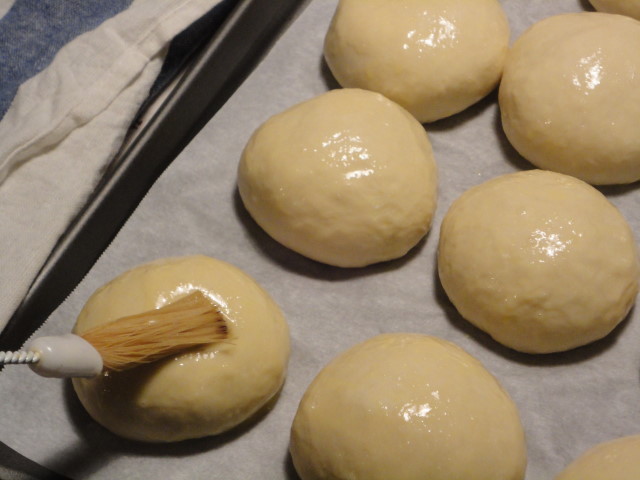 Then I covered the dough with a towel and let it proof for 60 minutes until they doubled again.  I preheated the oven to 400°F, and while I was waiting I brushed on egg wash and sprinkled some sesame seeds on top of each one.