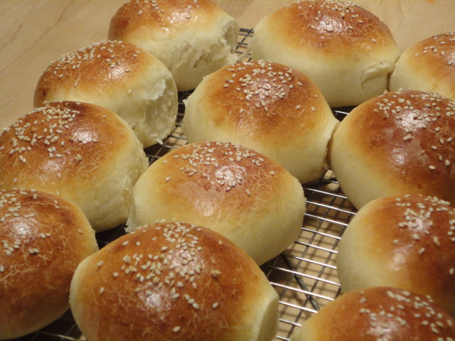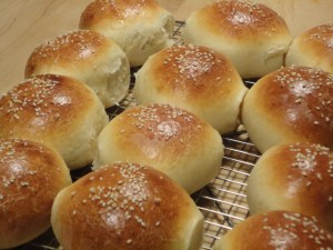 This is a versatile recipe.  You can make boules (round loaves), regular loaves, dinner rolls, hamburger rolls, or hot dog rolls.  To make dinner rolls, divide the dough into 18 balls.  To make hot dog rolls, divide the dough into 12 pieces and shape them into long hot dog roll shapes.  I was planning to make dinner rolls, but I changed it up to burger rolls.