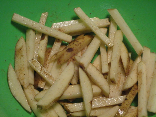 I started by cutting the potatoes into fries. You can peel them if you like, but I like the skins. I cut them into between a quarter-inch and a half-inch wide. Then I rinsed them and put them in bowl of water to soak. Soaking them extracts a lot of the starch, which we don’t want in this case. After 15-20 minutes, I preheated the oven to 450°F. Then I drained them and dried them well. Next, I put them back into the dried bowl, and tossed them with the oil and Cajun seasoning. I held off on the salt until the end.