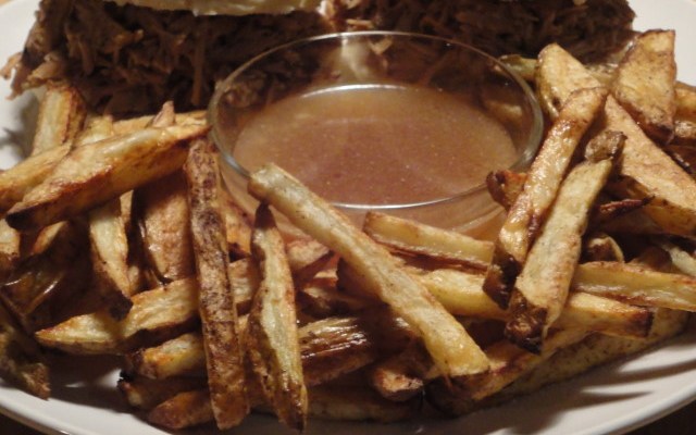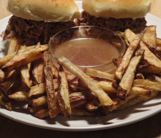 When I made my Pork Au Jus, I was looking for something to eat with it. It just so happened that I had a bag of potatoes, so I thought fries would be great. Getting nice crispy fries from the oven can be difficult, but these fries come out great every time.