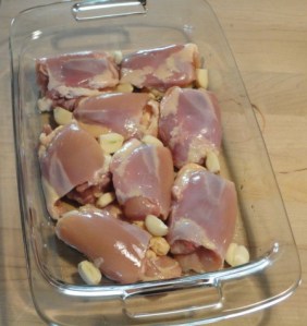 Splash some olive oil into the bottom of your baking dish or pan. Place the chicken into the dish, in one layer. I flip them over in the oil to coat them a bit. Place the crushed garlic cloves into the nooks and crannies between the chicken pieces.