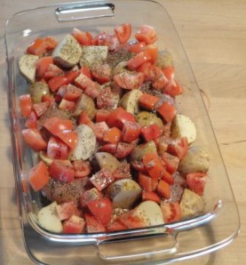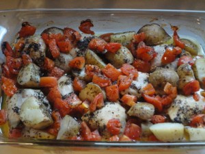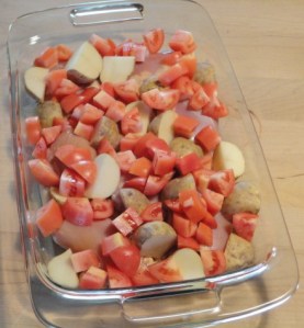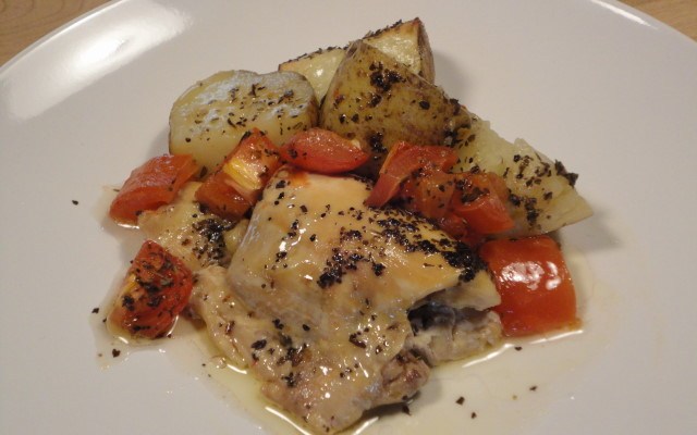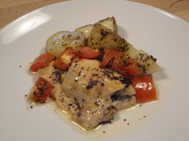 It’s a very basic recipe, that mainly involves placing the ingredients together in a pan and roasting them. The result is chicken that falls off of the bone and crispy potatoes in a kind of garlic and tomato sauce.