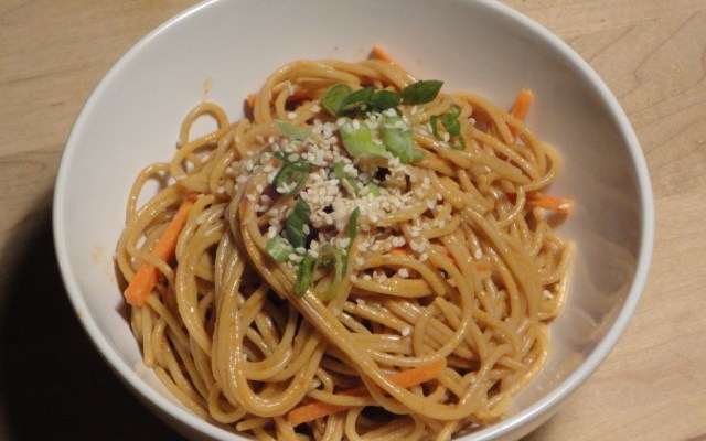 Today I was trying to think of a recipe that was easy with minimal cooking. Cold sesame noodles are nice and hearty, and you only need to actually cook the noodles. You can even use leftover spaghetti noodles, and then you don’t need to cook anything!