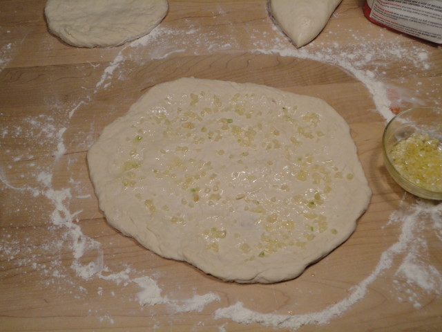 The first step is to swirl on some olive oil. You should use “more than you think you should”. You can adjust this, of course, but the oil is integral to this pizza. I tend to mix the garlic with some oil and just spread it around on the dough.