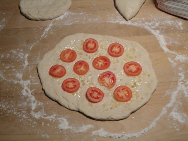 Now to start, have your dough ready to top. I used half of the dough from my pizza dough recipe. It makes a pizza that is approximately twelve inch wide. You may want to place the dough onto a peel or pan of some sort before you start to avoid difficulties later. I didn’t, and barely got it onto my peel. Of course, if you’re baking it on a pan, you can just assemble it on there. Preheat your oven to 450-500° F. The hotter the better, especially if you have a pizza stone.