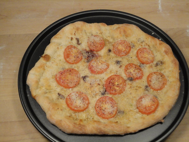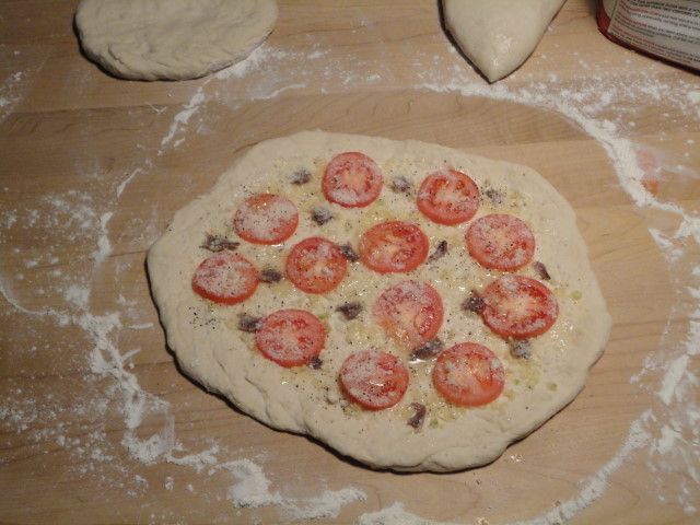 When it comes out, the bottom is crisp like a cracker. The top is alternately crispy and creamy from the oil and Parmesan cooking into the dough. The tomatoes add a nice tang, and the anchovies pop in now and again for a salty hello. I haven’t had this in quite a while, and making it has reminded me that it’s still my favorite.