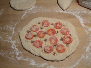 Next, add the anchovies. Obviously your taste is going to dictate the size of the pieces, or whether you add them at all. I never liked anchovies until I had this pizza. I tear them into tiny pieces and place them around the dough.