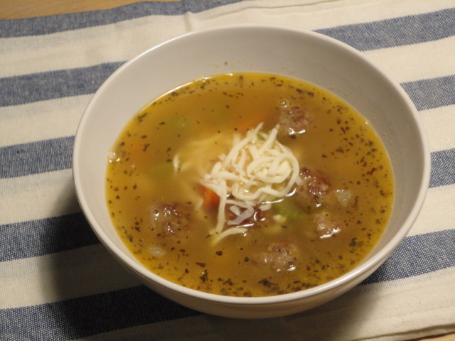 It’s been a mild prelude to winter here, but this weekend the weather finally got cold and even gave us a dusting of snow.  This has activated my soup gene, which often lies dormant for months at a time.  When I thought about making a soup, I decided there were three things I wanted: meatballs, pasta, and beans.  Now, some people might think that this is Italian Wedding Soup, but I don’t think so.  I have no idea, though; I’m Irish and single.