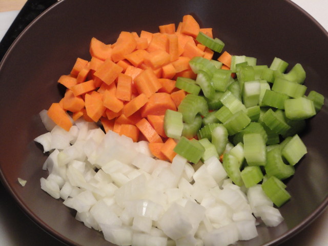 Now set them aside for a moment and get the rest of the ingredients ready.  For soup, I like to chop my vegetables roughly, instead of having them all perfect.  Carrots, celery, and onions are the base of many soups and other recipes, and are also called mirepoix.  In Cajun cooking, they are often called “The Holy Trinity”.